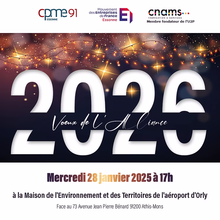 Mercredi 28 janvier 2026, la Maison de l’Environnement à Athis-Mons a accueilli les Vœux de l’Alliance 2026, un événement fédérateur organisé par la CPME 91, le MEDEF Essonne et la CNAMS IDF Essonne. Plus de 150 chefs d’entreprise, partenaires et acteurs économiques du territoire se sont réunis pour échanger et partager leur vision du développement de l’Essonne. Parmi les personnalités présentes, Patrick Briallart, Président de la CNAMS Île-de-France, a saisi l’occasion pour présenter le Livre Blanc de l’U2P, un outil clé pour les enjeux des élections municipales de 2026.